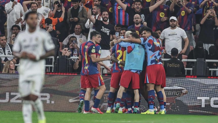 حسم نادي برشلونة موقعة الكلاسيكو أمام غريمه نادي ريال مدريد في نهائي كأس السوبر الإسباني بعد فوزه مساء اليوم في جده بنتيجة 3 اهداف مقابل هدفين
